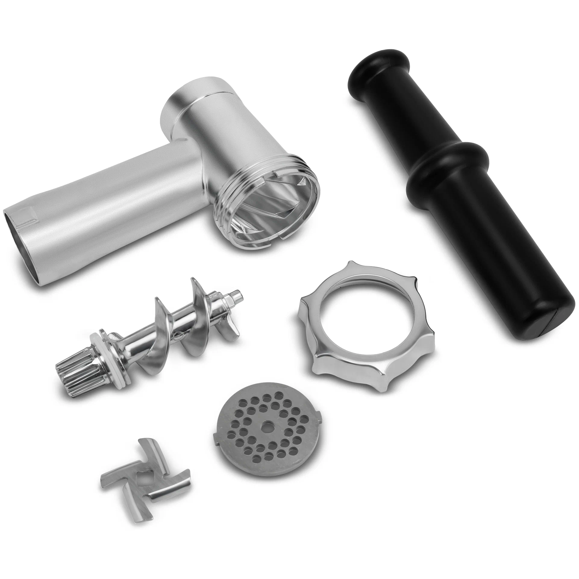 комплектация: мясорубка, головка мясорубки в сборе (с установленным шнеком, ножом, решёткой и гайкой), толкатель, лоток для продуктов, инструкция по эксплуатации; материал лотка: пластик