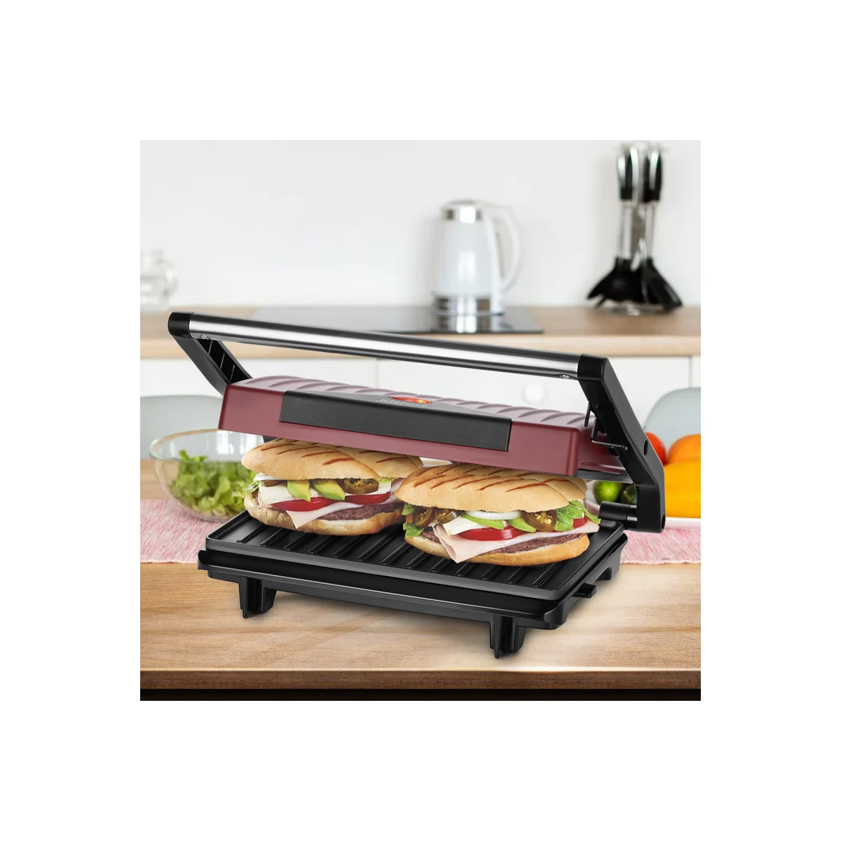 Технические характеристикиЦветчерный/красныйМатериал корпусанержавеющая сталь/пластикСъемные пластинынетРазмер рабочей поверхности230х145 ммАнтипригарное покрытиедаНагревательный элементзакрытыйРасположение нагревательного элементасверху и снизуОткрытие на 180°/положение барбекюнетРегулировка температурынетМощность750 ВтАвтоматическое отключениенетРучка с защитой от нагреваниядаУправление со смартфонанетПриложение для управлениянетГолосовой помощникнетДисплейнетТаймер обратного отсчетанетИндикатор нагревадаЛоток для жира и соканетГабариты без упаковки279х218x86 ммВес нетто1.3 кг