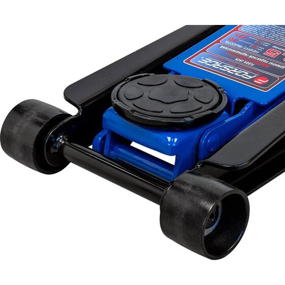 Домкрат оснащён двумя поршнями, обеспечивающими равномерное распределение нагрузки и стабильность при подъёме. Специальная педаль у основания ручки ускоряет процесс подъёма, а прорезиненная накладка на рукоятке повышает комфорт при работе. Конструкция включает 2 фиксированных и 2 поворотных колеса, что обеспечивает отличную мобильность. Предохранительный клапан гарантирует безопасность эксплуатации.