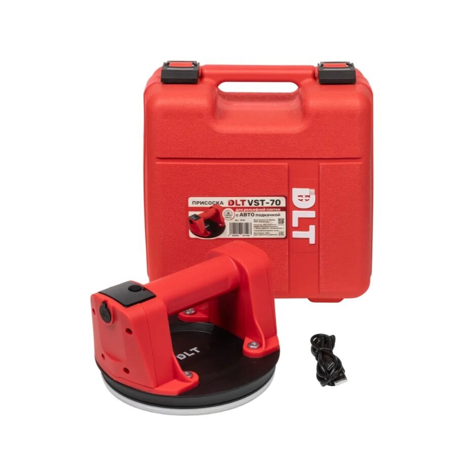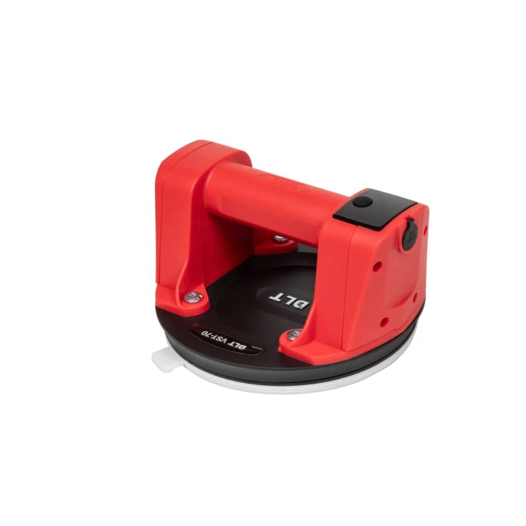 Присоска DLT VST-70 оснащена встроенным электрическим насосом, датчиком давления, дисплеем для визуального контроля уровня заряда батареи и массы удержания. Датчик давления анализирует силу разрежения воздуха и автоматически включает насос, когда требуется восстановить необходимые параметры вакуума (автоматическая подкачка).