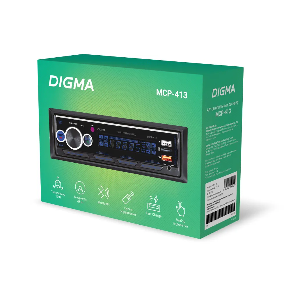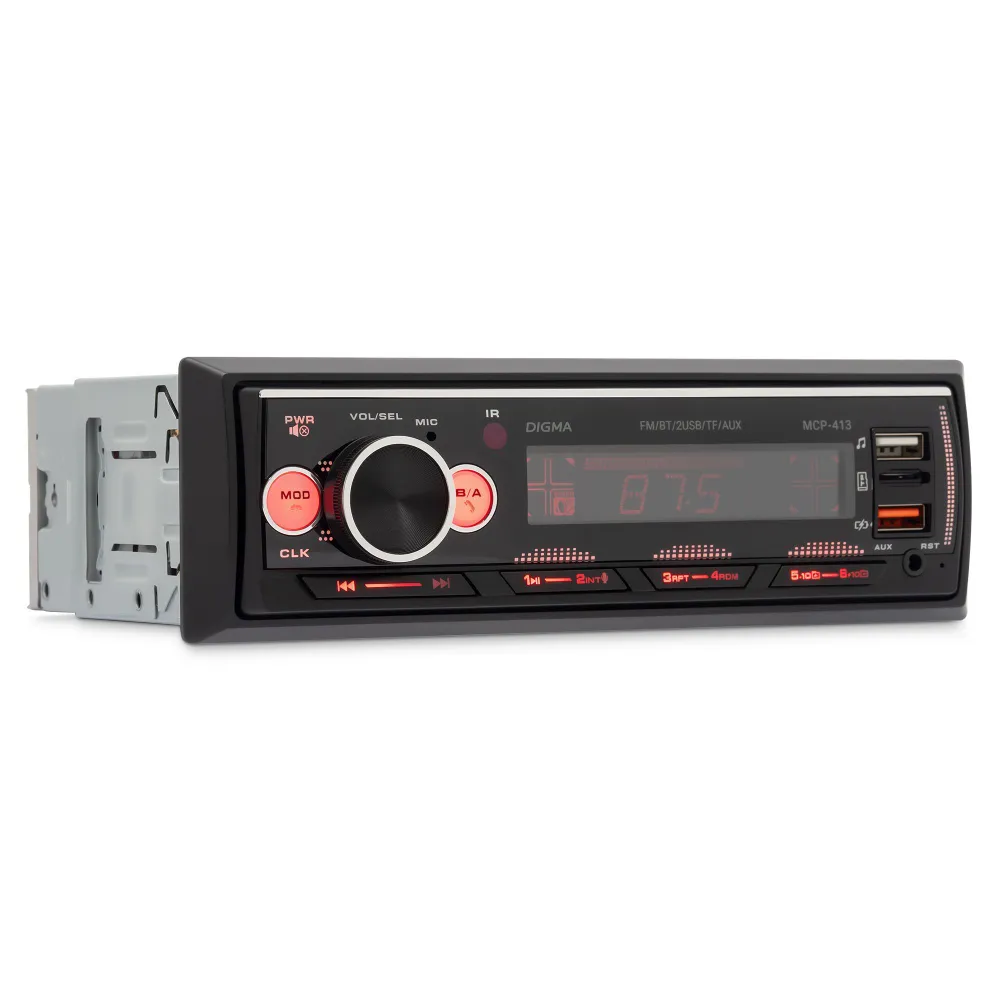 ЗвукРегулировки звукаГромкость воспроизведения, ЭквалайзерТехнические свойстваТипоразмер1 DINКоличество встроенной памяти, ГБ0Количество ядер0Передняя панельФиксированнаяКоличество каналов, шт.4Номинальная выходная мощность на канал, Вт45ОсобенностиUSB-вход на передней панелиЦвет подсветки кнопокбирюзовый, белый, голубой, зеленый, желтый, красный, лагунаФункцииBluetoothДаПульт ДУДаПоддерживаемые форматыMP3, FLACПоддержка RDSнетДиапазон радиоРасширенный FMСовместимые платформыiOS, AndroidОбщиеПартномер (артикул производителя)MCP-413БрендDigmaЭкранТип экранаLCDРазрешение экрана128x64Диагональ экрана4.0"ПитаниеНапряжение питания, В12Оперативная память, ГБ0Интерфейсы3.5 мм, Разъем для антенны (TV/F), USB Type-AЦветЧерный